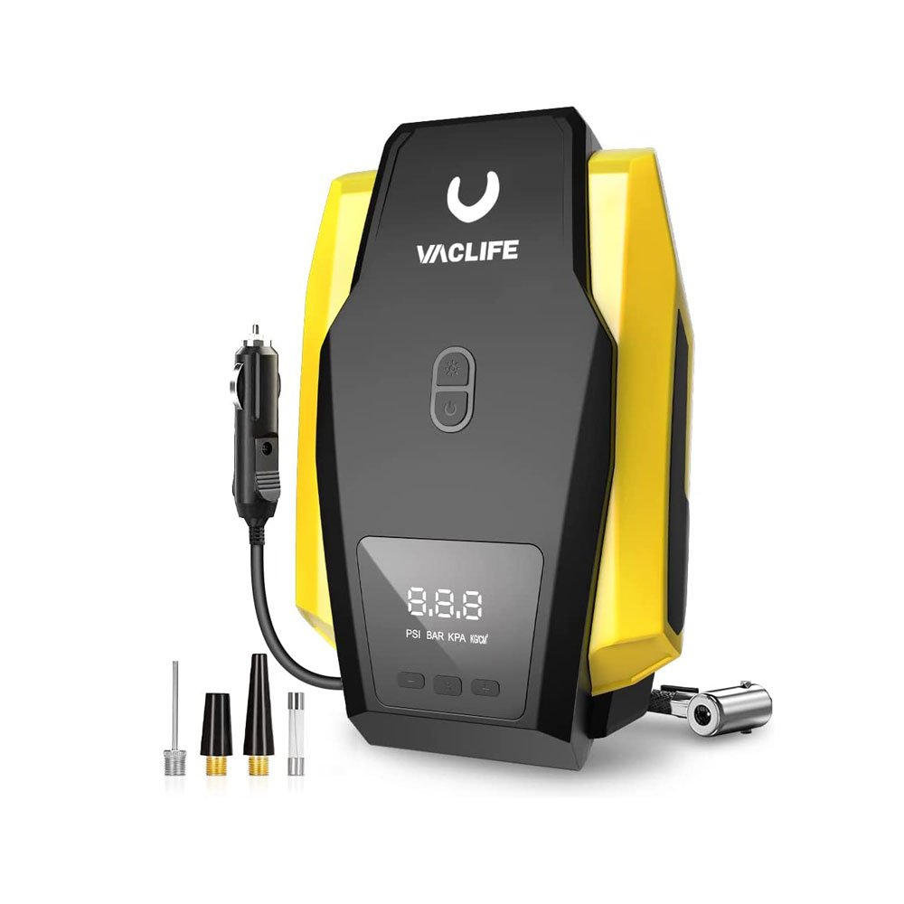 - [MULTIPURPOSE NOZZLES] VacLife tire pump is equipped with 3 additional nozzles besides the original. A wider applying range to cover various needs for inflatables such as vehicle tires and sports or entertainment equipment including compact or midsize Sedan, SUV, ATV, bike, motorcycles, air mattress, inflatable boats, balls.