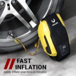 - [FAST INFLATING & EASY OPERATION] This auto tire air compressor can inflate your standard car tires in seconds. Plug it into the 12V power outlet in your car and attach the stem to the tire valve. A simple press on the car air compressor and it will do all the work for you. A great solution for emergency on the way.
