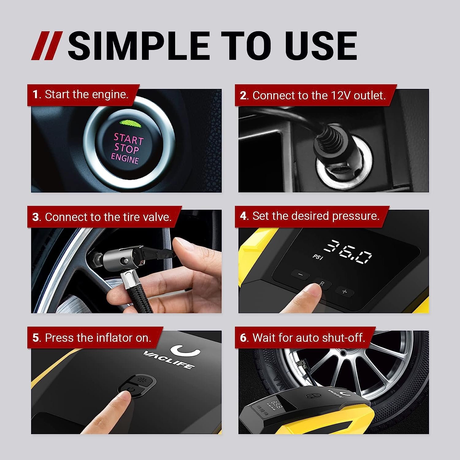 - [AUTO SHUT OFF] Simplicity meets functionality. VacLife car air pump provides you with rest-assured using experience based on the auto-shut off function. Preset the desired pressure level and start inflating job. The car air compressor will shut off automatically at the desired level. There is no need to worry about over inflating, VacLife smart inflator for tires got your back.